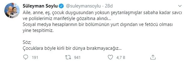 "Aile, anne, eş, çocuk duygusundan yoksun şeytanlaşmışlar, sabaha kadar savcı ve polisler marifetiyle gözaltına alındı. Sosyal medya hesaplarının bir bölümünün yurt dışından ve FETÖ'cü olması yine tespitimiz. Söz, çocuklara böyle kirli bir dünya bırakmayacağız."