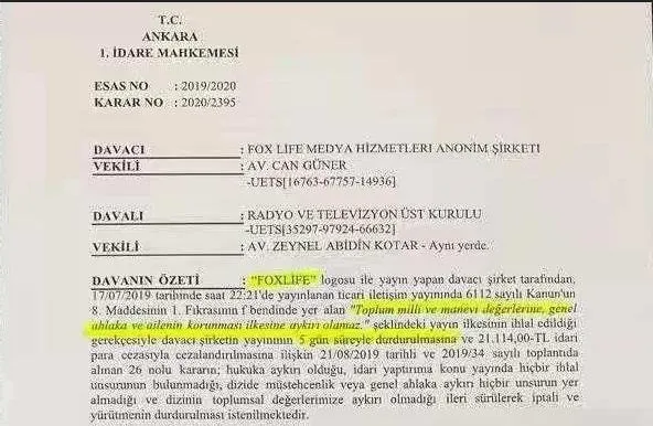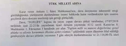 Foxlife'ın yayınladığı diziye ilişkin "Toplum milli ve manevi degerlerine, genel ahlaka ve ailenin korunması ilkesine aykırı olamaz." seklindeki yayın ilkesinin ihlal edildigi gerekçesiyle" dava açıldı. 5 gün süreyle durdurulmasına ve 21.114,00-TL idari para cezasıyla cezalandırılmas istendi. Ankara 1. İdare Mahkemesi ise skandal bir karar ile, 'hiçbir ihlal unsurunun bulunmadığı, dizide müstehcenlik veya genel ahlaka aykırı hiçbir unsurun yer almadığı' gerekçesiyle iptal etti.